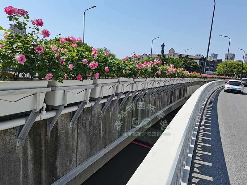 橋梁護欄花箱,如果是可拆卸的護欄直接可以用大型組合花箱代替。如果是與橋面一體澆筑的護欄,只能采用懸掛式花盆裝飾,或在橋墩上面打孔安裝花槽后,再放入塑料花盆裝飾。